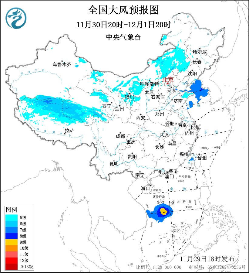 11月30日20时至12月1日20时,新疆东部、内蒙古、西北地区东部、华北北部、西藏北部等地部分地区有5~6级风、阵风7~9级。渤海海峡、黄海北部和中部海域将有7~8级、阵风9~10级的大风,南海中西部和西南部海域将有7~8级、阵风9级的旋转风,局部海域风力可达9级、阵风10~11级。