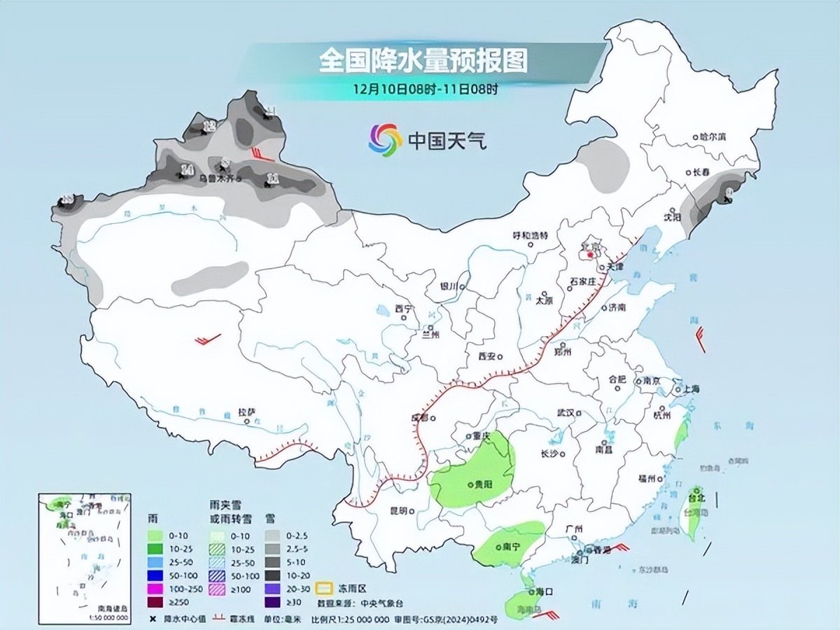 中央气象台预计,今天,黑龙江北部和东南部、新疆北部、西藏中北部和西部、青海南部等地部分地区有小雪或雨夹雪,其中,新疆北疆北部和伊犁河谷等地部分地区有中到大雪。西南地区东北部、云南东北部、台湾岛等地部分地区有小到中雨,其中,台湾岛东北部局地有大雨。