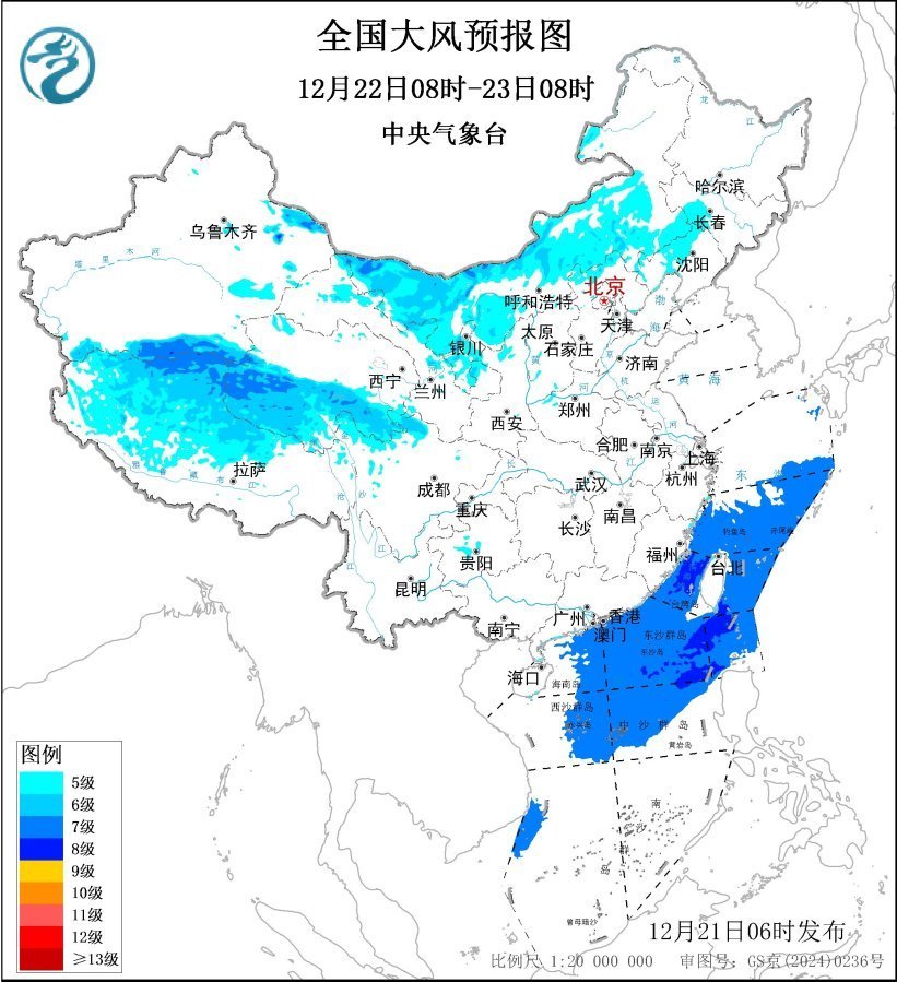 12月22日08时至23日08时,内蒙古大部、东北地区南部、华北北部、新疆北疆东部、宁夏、陕西北部、西藏北部、青海中南部等地有5~6级风,阵风7~9级;东海南部海域、台湾海峡、台湾以东洋面、巴士海峡、南海北部和中部海域将有7~8级、阵风9~10级的大风。