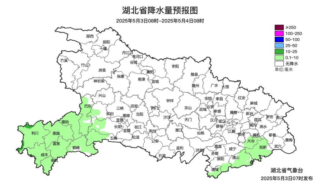 5月4日08时-5日08时,江汉平原、鄂东北、鄂东南多云转中到大雨,局地暴雨;其他地区多云转小到中雨。省内部分地区伴有短时强降水等强对流天气。最高气温西部19~24℃、东部25~29℃,最低气温14~19℃,偏东风转偏北风3级、阵风4到5级。